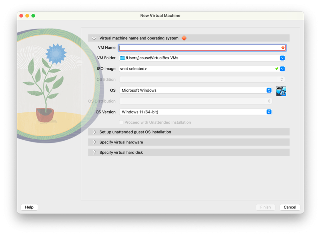 La creación de máquinas virtuales en VirtualBox requiere de un archivo en formato ISO del sistema operativo a virtualizar, podemos descargar los sistemas operativos mas populares como Windows 10 y 11 desde la página www.microsoft.com/downloads, la versión de macOS soportada en VirtualBox la podemos descargar gratuitamente desde la App Store y las diferentes distribuciones Linux desde sus respectivas páginas oficiales. Al seguir los pasos para crear una nueva máquina virtual, tenemos la siguiente pantalla en donde para facilitar el uso a usuarios inexpertos o si queremos solo ver de forma rápida la creación de máquinas virtuales, debemos de indicar la ubicación de este archivo en formato ISO y dejamos las demás opciones como están. Opciones avanzadas incluyen definir el tamaño del almacenamiento, la cantidad de memoria, tamaño de la pantalla, opciones de red, etc.